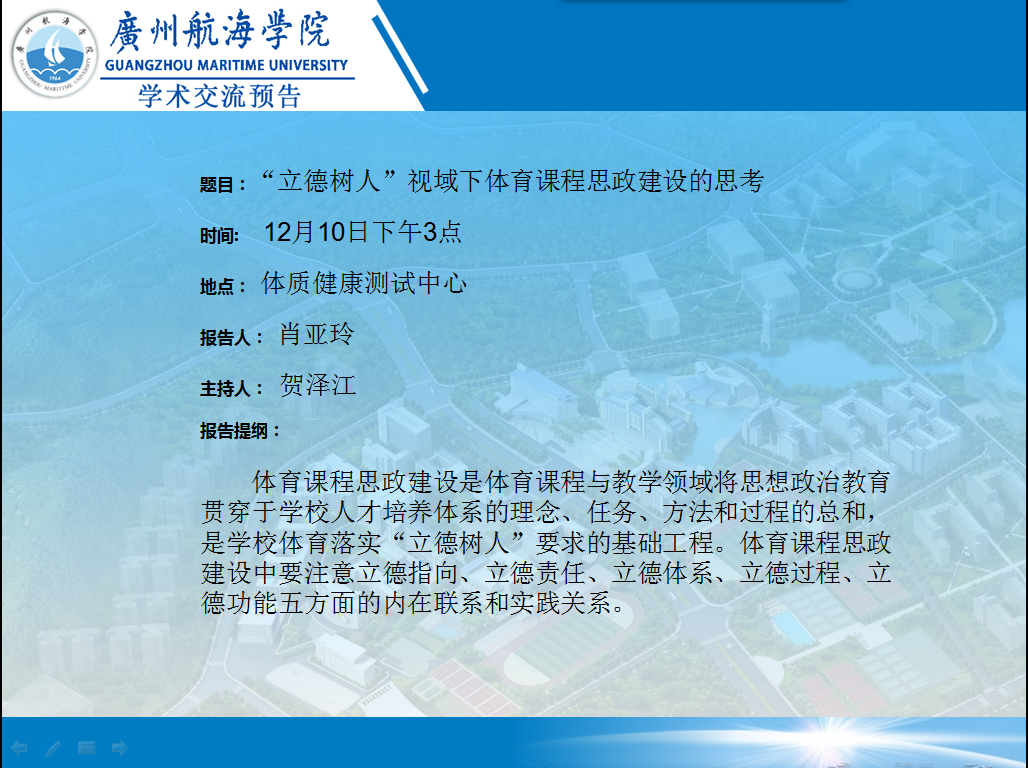 (公共体育教学部供稿)12月10日下午两点,在田径场105会议室,公体部主任肖亚玲教授向全体教职工作了“立德树人视域下体育课程思政建设的思考”学术讲座。