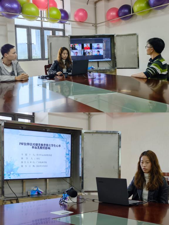 (公共体育教学部供稿)3月25日下午,公体部刘巧老师在第十二届全国体育科学大会线上会议上,作“PNF拉伸法对健美操普修老员工心率和血乳酸的影响”的专题研究报告,这是公体部的第一次!