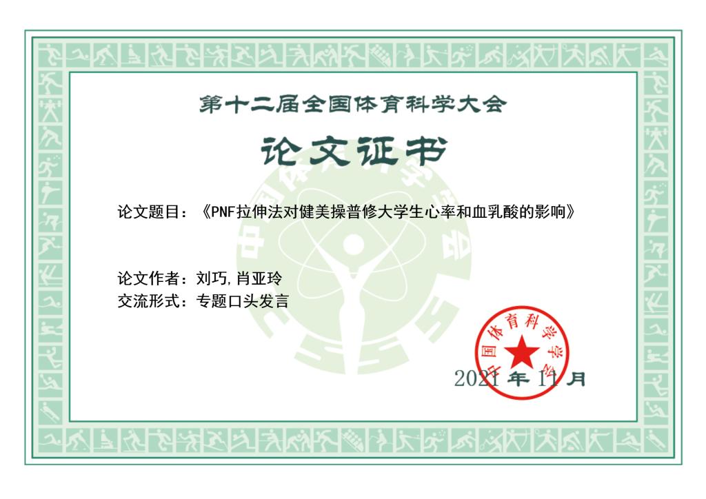 本届大会主题为“科技赋能体育·创新驱动融合”,共收到来自全国各有关单位和个人报送的论文16776篇,经过资格审查、重复率筛查和专家评审等程序,录用论文7727篇,其中专题报告3238篇,墙报交流4489篇。刘巧、肖亚玲老师撰写的《PNF拉伸法对健美操普修老员工心率和血乳酸的影响》一文被大会专题报告录取。