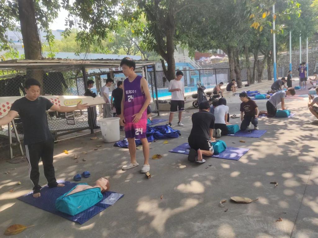 4月9日下午2:30,在游泳池,周智权老师先对救生员进行了岸上心肺复苏的培训,然后对救生员进行了速游、潜泳、拖带三个水中项目进行了实操培训。