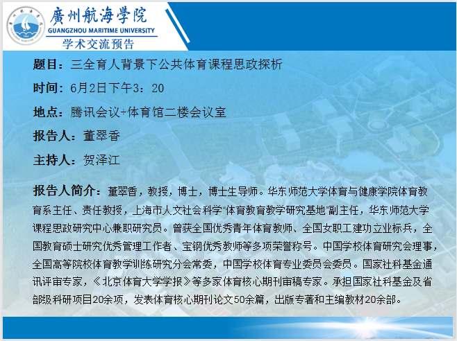 董翠香学术讲座预告:三全育人背景下公共体育课程思政探析