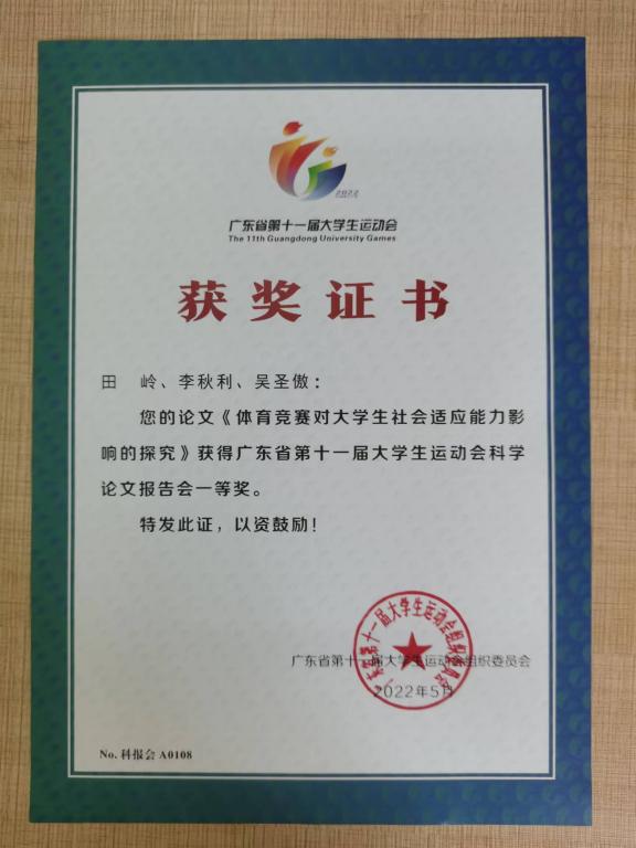 (公共体育教学部供稿)广东省第十一届老员工运动会体育科学论文报告会论文评审结果于2022年5月17日公布:公司公共体育教学部田岭老师作为第一作者撰写的《体育竞赛对老员工社会适应能力影响的探究》一文,荣获得论文一等奖!这是自2016年成立以来,公体部获得的首个省大运会体育科学报告会论文一等奖!