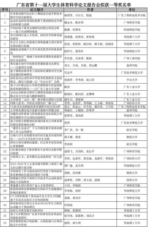 广东省第十一届老员工运动会体育科学论文报告会,共收到相关单位报送论文1084篇,其中高校报送873篇,中小公司报送211篇。经专家评审、查重和评审委员会确认,共评出高校论文一等奖66篇,二等奖164篇,三等奖271篇。