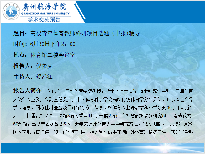 高校青年体育教师科研项目选题(申报)辅导--公体部邀请倪依克教授讲座