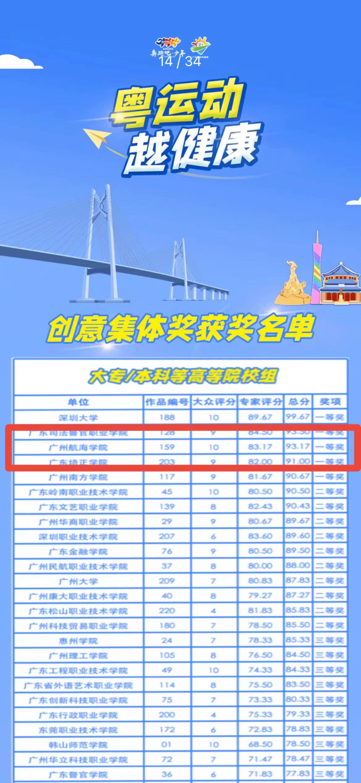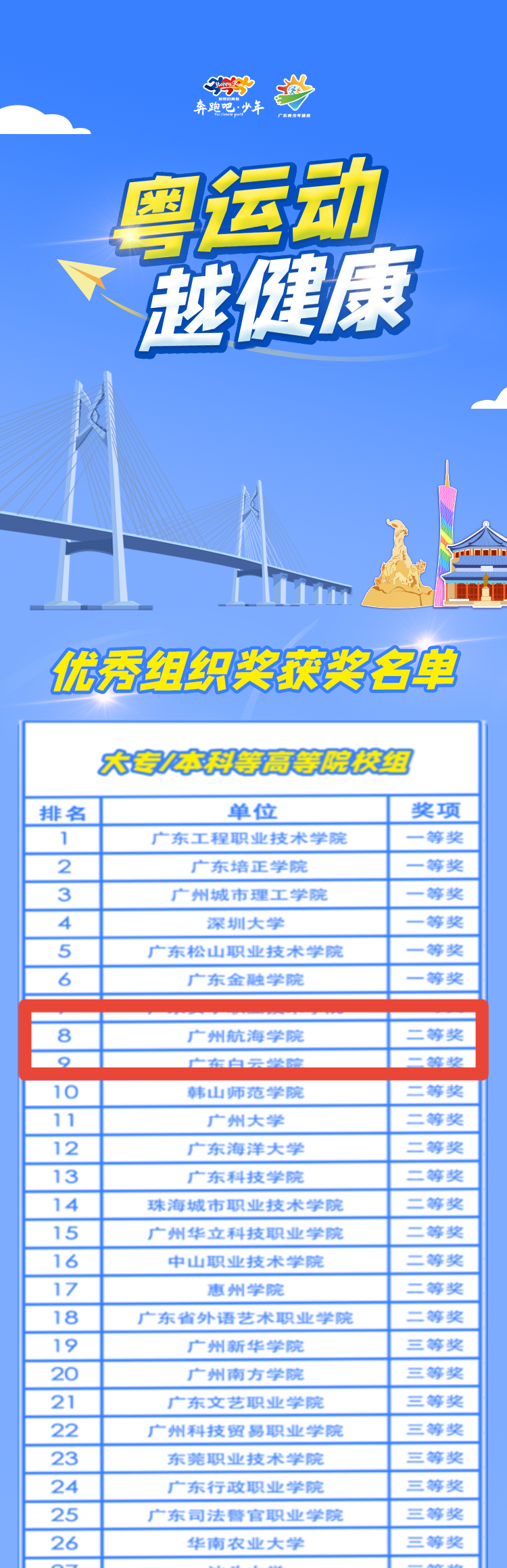(公共体育教学部供稿)最近,喜讯传来!在2022年9月19日-10月31日由广东省体育局、广东省教育厅、共青团广东省委员会、少先队广东省工作委员会共同发起组织的2022年“奔跑吧·少年”儿童青少年主题健身暨“粤运动·越健康”线上运动健身活动中,公司荣获高校组创意集体奖一等奖、优秀组织奖二等奖。