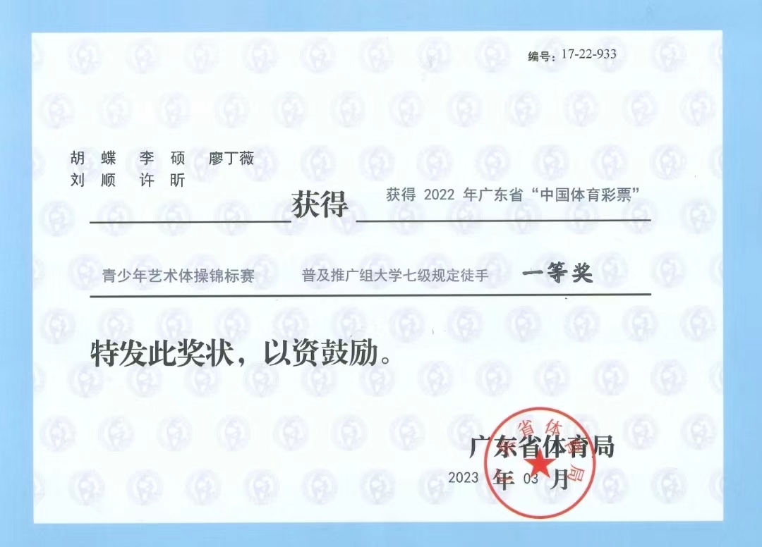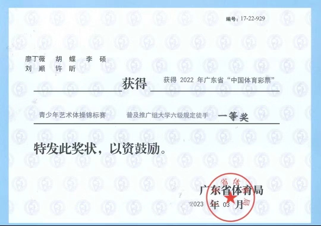 (公共体育教学部供稿)因疫情延期举办的2022年广东省青少年艺术体操锦标赛于2023年2月28日在佛山顺德容桂体育中心开幕,比赛共持续4天。公司艺术体操代表队在教练员李冰老师的带领下参加了大学组6级规定项目、7级规定项目的比赛,荣获了2个一等奖。